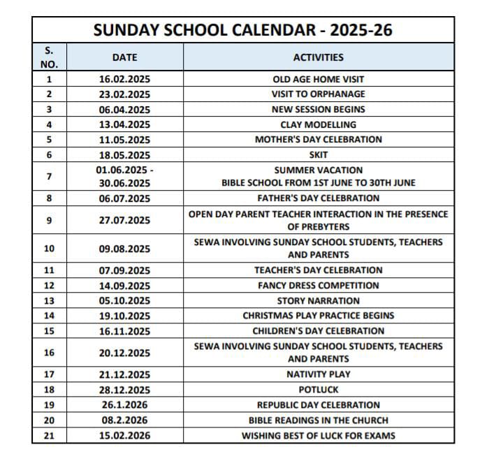 Sunday school welcomes children aged between 04 to 18 years, from 9.15 to 10.15 a.m. and it is blessed with a team of dedicated, talented and experiential teacher who have committed their time and experiential service to mature and direct the youngest segment of the church family.